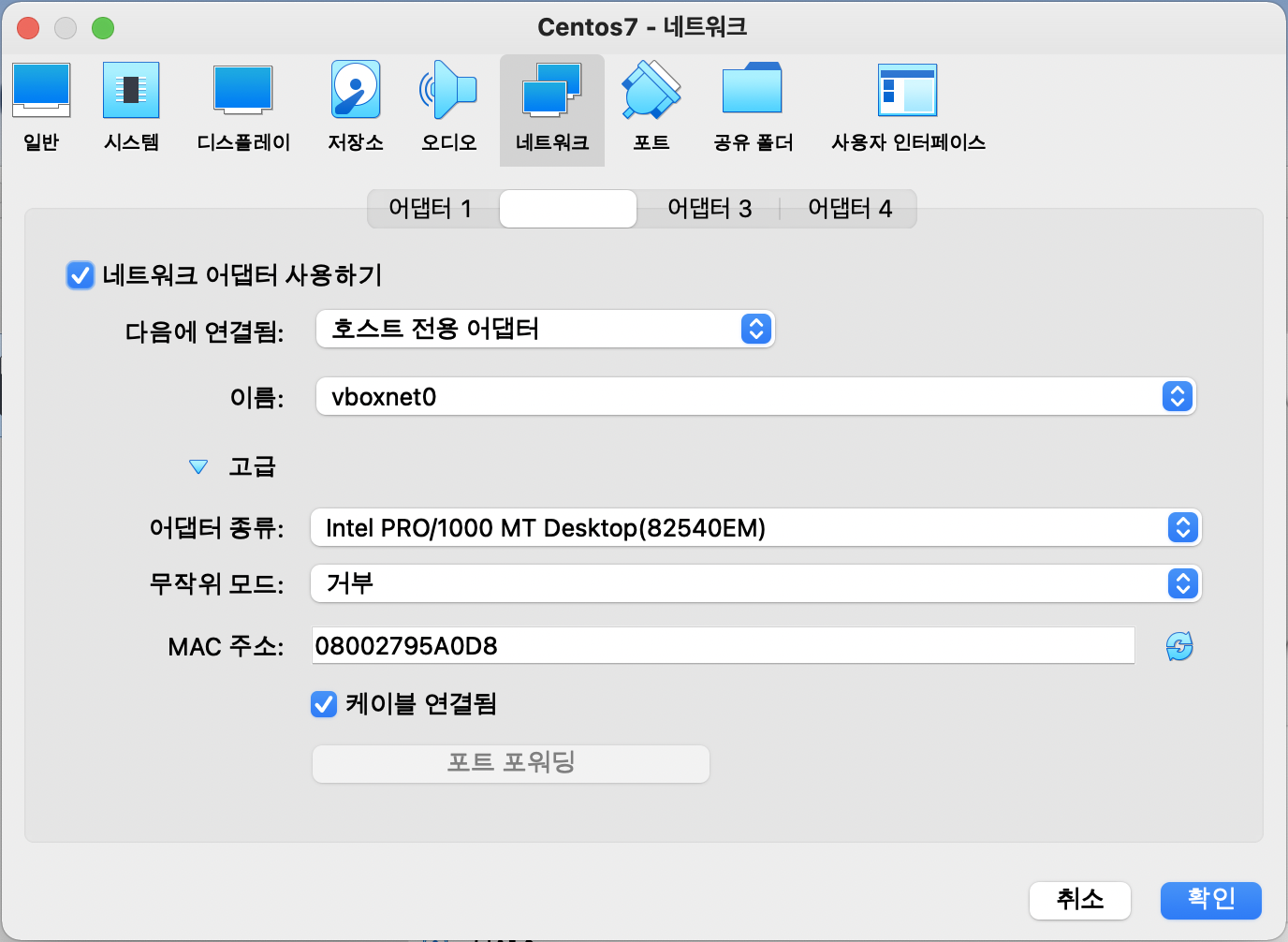 설정을 눌러 들어가서 어댑터 1의 NAT으로 되어 있는 것은 그대로 두고,