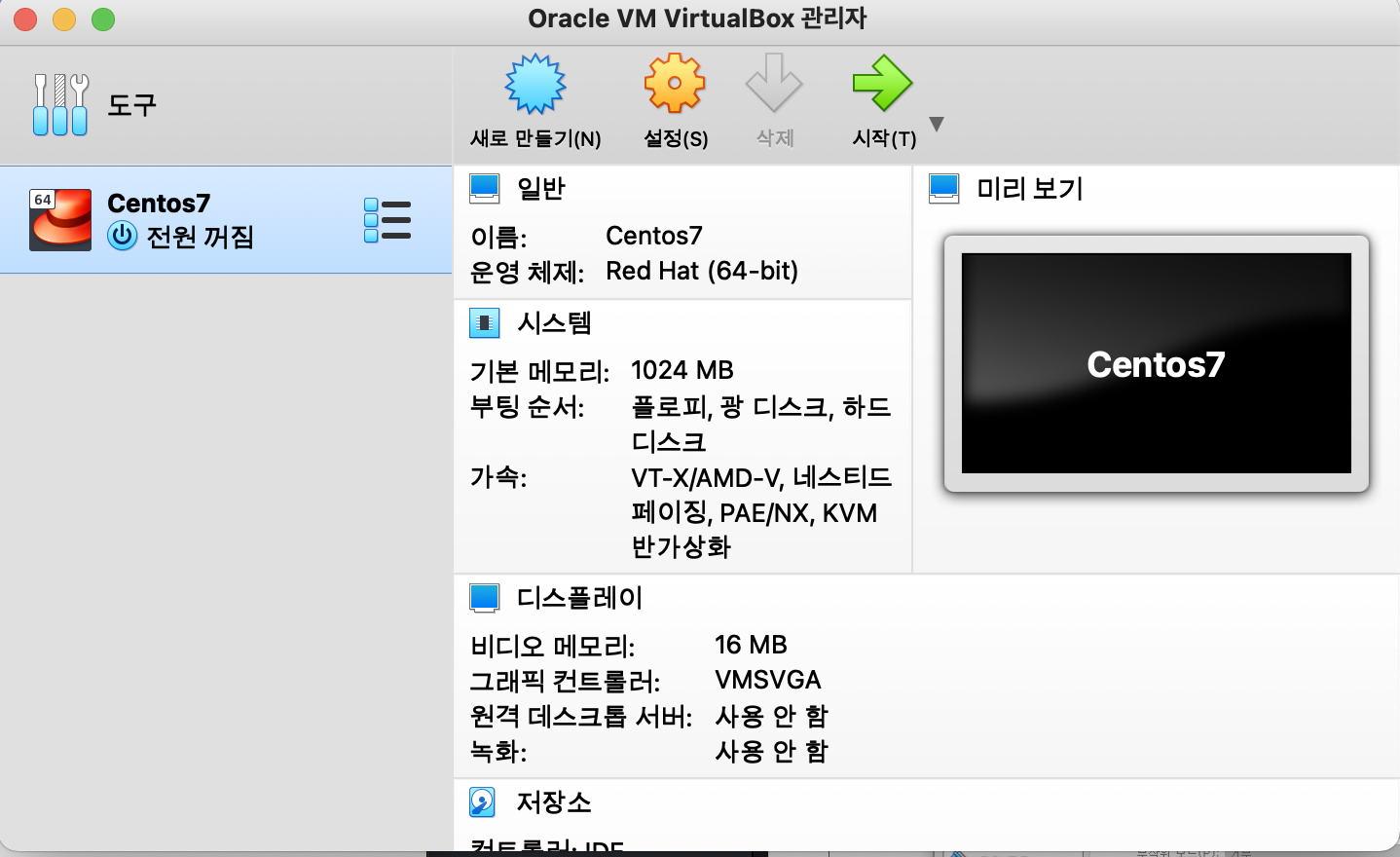 여기까지 되었다면, Centos7이라는 이름으로 만든 VM을 클릭하고, 디스크 이미지 파일을 넣어줍니다.(Centos7 minimal)