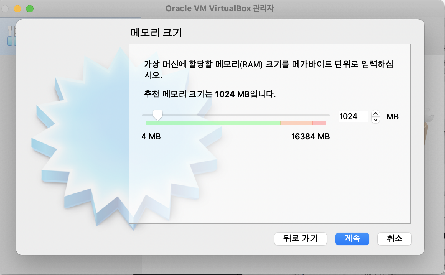 계속을 누르면, 다음 순서로 사용할 VM의 메모리 크기를 지정할 수 있습니다.