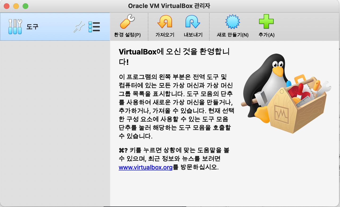 virtualbox 홈페이지(www.virtualbox.org)에서 자신의 환경에 맞는 버전을 무료로 다운로드할 수 있고, 다운 후 실행하면 아래와 같이 기본 창이 나옵니다.